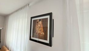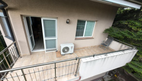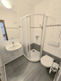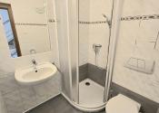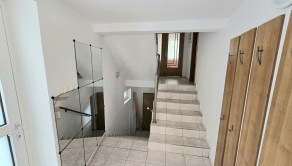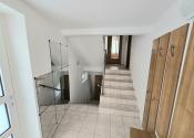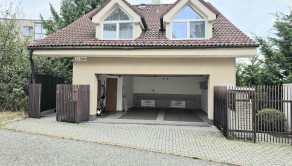 V priečelí domu je 5 m široká diaľkovo ovládaná brána do dvojgaráže z ktorej je priamy vstup do chodby väčšej bytovej jednotky (160 m2) pozostávajúcej z obývačky s kuchynským kútom, kúpeľňou s umývadlom, WC a sprchovacím kútom a balkónom s nádherným výhľadom na Rakúsko.
