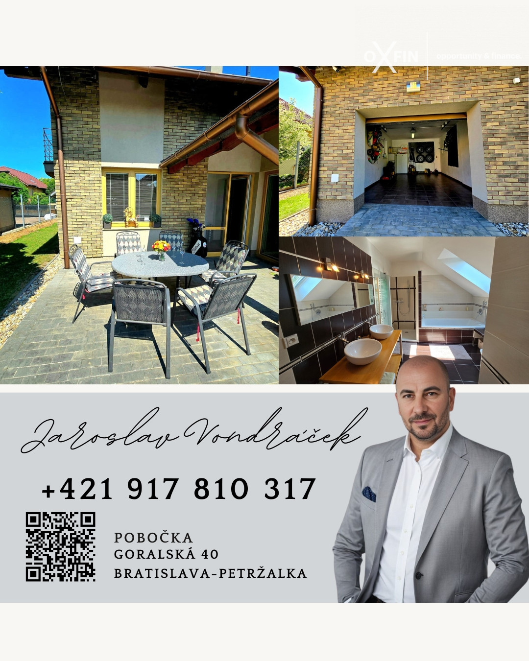 Odporúčanie makléra: Tento rodinný dom si zamilujete okamžite po vystúpení z auta, ktoré zaparkujete na dvore priamo pred garážou alebo v nej. Okolie rodinného domu je dychberúce, nakoľko sa tento skvost nachádza vo veľmi vyhľadávanej lokalite s výbornou dostupnosťou do Bratislavy. Kompletná občianská vybavenosť je 2 minúty autom, alebo 10 minút pešo. Mesačné náklady má súčasný vlastník vo výške 154,- € za všetky energie, služby a dane (plyn, vodné a stočné, elektrina, odvoz odpadu a daň z nehnuteľosti). Veľmi nízke náklady sú výsledkom nadštandardného zateplenia z prírodného materiálu a efektívného kúrenia. Na obklad domu je použitý kvalitný taliansky obklad. Pri predaji Vám poskytneme všetky revizné správy, ktoré budete potrebovať pre financujúcu banku. Na osobnej obhliadke Vám ukážeme výnimočnosť tohto rodinného domu. Celý pozemok je vyvýšený oproti uličnej kóte a bolo sem navezených niekoľko sto kubíkov zeminy, čo jednoznačne oceníte. Dom bol obývaný len 3 roky (keďže rodina dlhodobo žila v zahraničí), zvyšok času bol pravidelne 3 krát do mesiaca udržiavaný, vykurovaný a servisovaný. Dom je v pôvodnom stave, keďže bol postavný z tých najkvalitneších a nadštandardných materiálov. Podlahové kúrenie sa nachádza na obidvoch poschodiach. Schodisko, šatník, špajza a spálňa je vybavená nábytkom na mieru. Sedenie na záhrade je orientované na východ, preto v lete po práci Vás bude čakať posedenie v tieni. V bazéne sa momentálne nachádza 8 m3 dreva, ktoré sú pre ako pozornosť od majiteľa. Bazén je vstavaný včetne vstavanej technickej šachty, len si treba vymeniť čerpadlo a sprevádzkovať ho. Popri celom oplotení domu je príprava na novú výsadbu Vašich okrasných, prípadne ovocných stromčekov, celá záhrada má automatickú závlahu.
