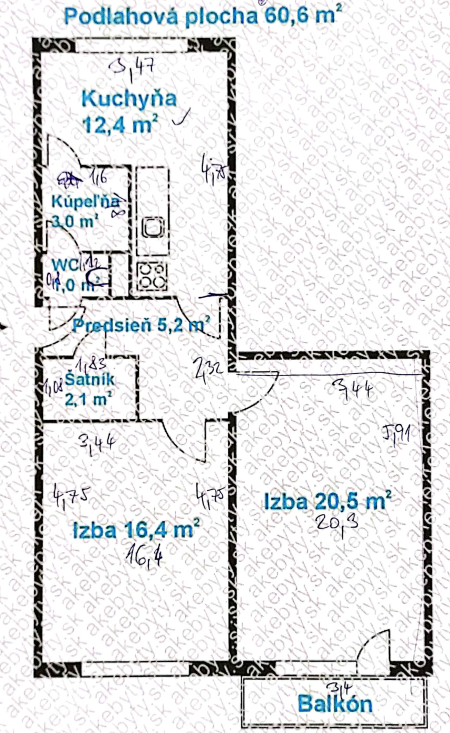 Výmera: 60,6 m² + 3,4 m² balkón + 1 m² pivnica